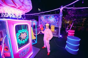 会場内で一際目を引いたのが、「脳汁スタンド」のために特別に制作した脳汁ドリンクを供給する給油機型ドリンクスタンド。トリガーを引くとLEDが仕込まれたホースが光りながら、色鮮やかなドリンクがノズルから注がれる仕掛けがされており、ドリンク購入者自身でカップに注いでいただくという体験をご提供しました。また、ドリンクスタンドの上部で輝く鮮やかなピンク色の「巨大脳みそ」はきらびやかにライトアップされ、会場内の至る所に仕込まれたLEDとも連動して、他では体感できない非日常的な脳汁空間を演出しました。